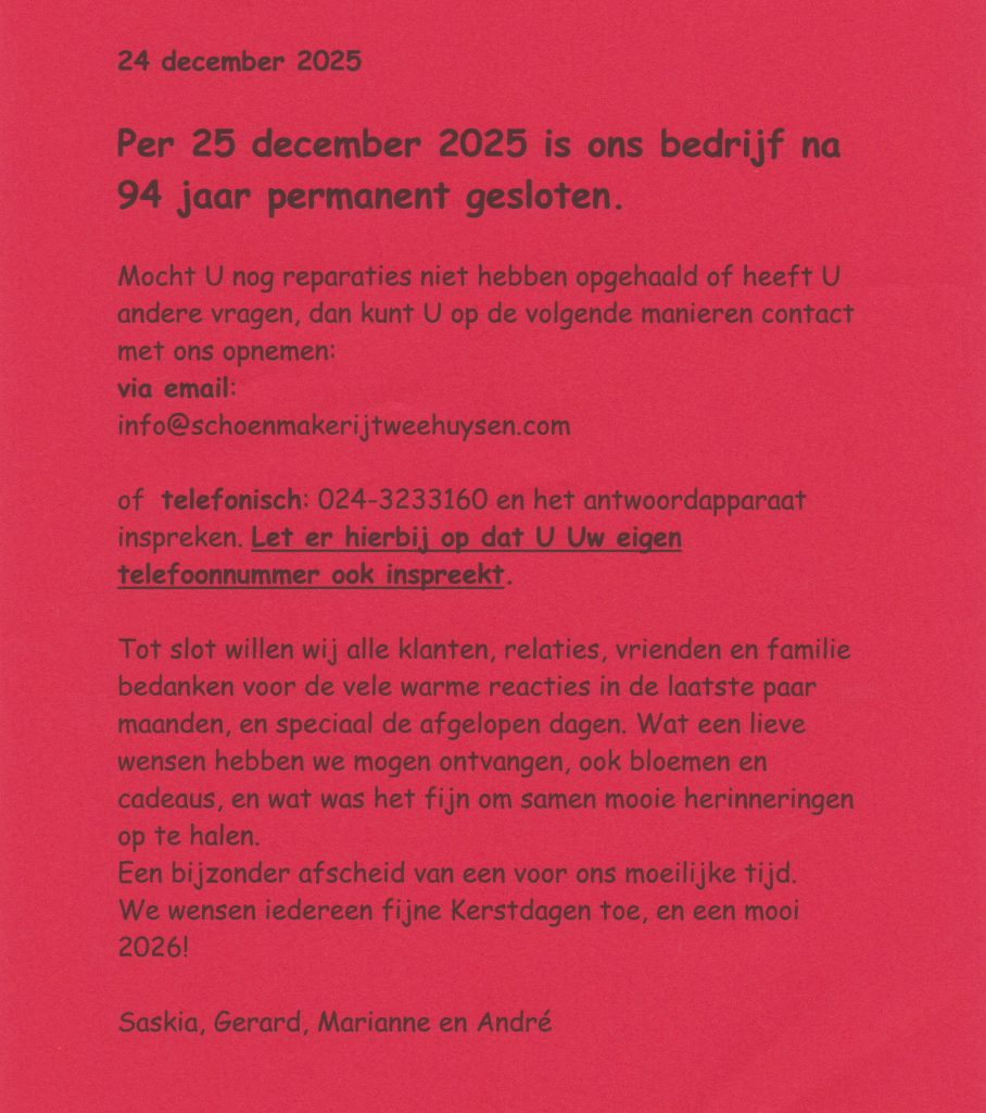 Als familiebedrijf hebben wij sinds 1932 met veel plezier Uw schoenen, tassen, handschoenen, stoelen en nog veel meer, mogen repareren. Velen van U was het al opgevallen dat sinds mijn ongeval (niet werk-gerelateerd) twee jaar geleden, de openingstijden nooit meer ‘normaal’ zijn geworden. Helaas is het voor mij fysiek niet meer mogelijk gebleken om de zaak voort te blijven zetten.