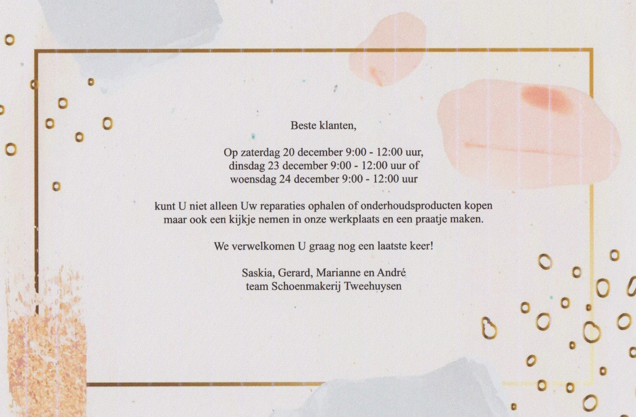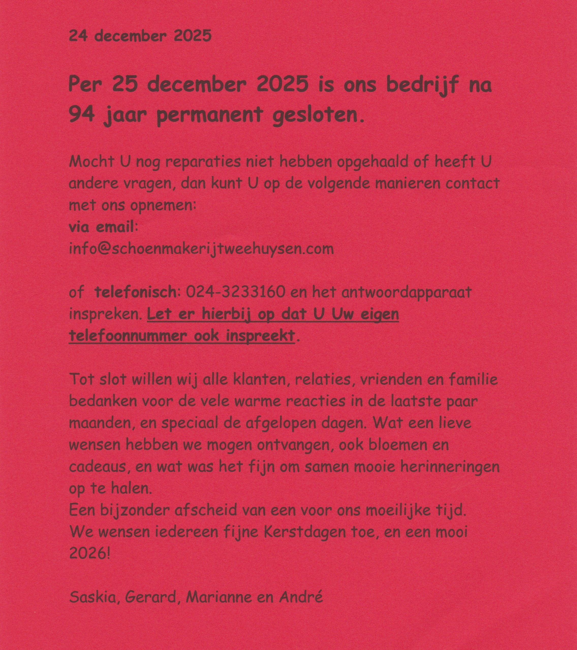 Wij danken alle klanten van harte voor het in ons gestelde vertrouwen, vaak tientallen jaren lang. Wij hopen U vóór Kerstmis nog eens in de winkel te mogen verwelkomen.